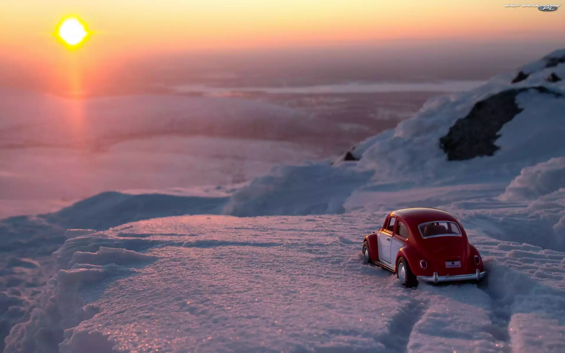 Zachód słońca, Zabawka, Zima, Volkswagen Garbus- Zdjęcia samochodów